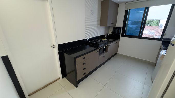 Studio de 1 quarto, com planejados, semi mobiliado, 2 ar condicionados, fechadura digital, 1 vaga de garagem, elevador.